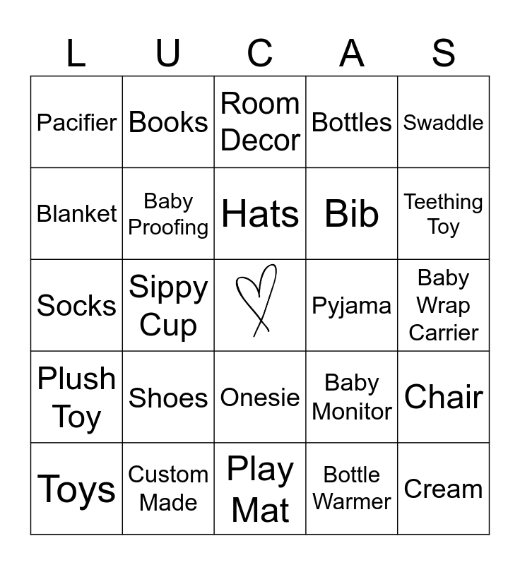 This bingo card has a free space and 24 words: Shoes, Custom Made, Hats, Toys, Swaddle, Pacifier, Blanket, Books, Pyjama, Onesie, Bib, Socks, Baby Monitor, Chair, Baby Proofing, Bottle Warmer, Baby Wrap Carrier, Room Decor, Teething Toy, Sippy Cup, Cream, Plush Toy, Bottles and Play Mat.