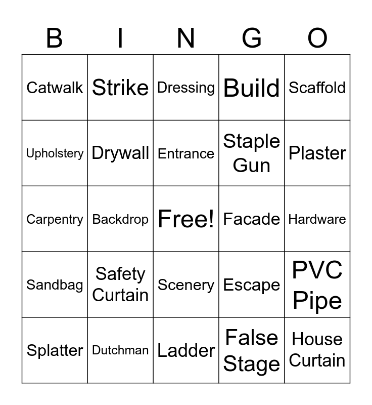 This bingo card has a free space and 31 words: Ladder, Auditorium, Backdrop, Carpentry, Catwalk, Dressing, Drywall, Escape, Facade, False Stage, Hardware, House Curtain, Illusion, Legs, Plaster, Props, PVC Pipe, Safety Curtain, Sandbag, Scenery, Scaffold, Set, Splatter, Strike, Staple Gun, Upholstery, Build, Carpentry, Dutchman, Entrance and Foam Insulation Board.