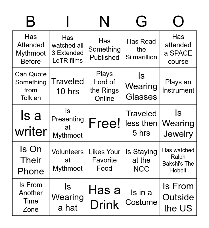 This bingo card has a free space and 29 words: Is From Another Time Zone, Is At Their First Mythmoot, Is Presenting at Mythmoot, Is From the Same Time Zone, Has Attended Mythmoot Before, Has Something Published, Traveled 10 hrs, Volunteers at Mythmoot, Traveled less then 5 hrs, Is Wearing a hat, Is Wearing Jewelry, Is From Outside the US, Has a Drink, Is in a Costume, Plays an Instrument, Can Whistle, Likes Your Favorite Food, Is On Their Phone, Has attended a SPACE course, Is a writer, Is Staying at the NCC, Drove to Mythmoot, Is Wearing Glasses, Can Quote Something from Tolkien, Has Read the Silmarillion, Has watched all 3 Extended LoTR films, Has watched Ralph Bakshi's The Hobbit, Plays Lord of the Rings Online and Has Read a Book This Year.