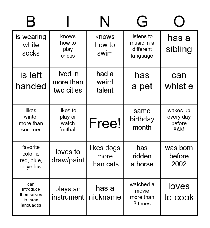 This bingo card has a free space and 24 words: loves to draw/paint, plays an instrument, had a weird talent, can introduce themselves in three languages, has a sibling, is wearing white socks, is left handed, knows how to play chess, same birthday month, likes dogs more than cats, has a pet, likes winter more than summer, has ridden a horse, was born before 2002, lived in more than two cities, watched a movie more than 3 times, wakes up every day before 8AM, knows how to swim, can whistle, likes to play or watch football, loves to cook, favorite color is red, blue, or yellow, listens to music in a different language and has a nickname.