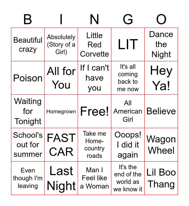 This bingo card has a free space and 75 words: FREE, Dancing Queen, Little Red Corvette, You're my Best Friend, Living Proof, Sweet Child, Murder on the Dance floor, ABC, A Bar Song (Tipsy), Higher, Che La Luna, Conga, If I can't have you, Poison, Pepas, Homegrown, Loving you Easy, Lil Boo Thang, Houdini, Dance the Night, Mr. Brightside, Waiting for Tonight, All for You, Absolutely (Story of a Girl), LIT, Fat Lip, Show me Love, MacArthur Park, Disco Inferno, September v Hip Hop, I Like to Move It, Love Don't Cost a thing, ...Baby one more time, Ooops! I did it again, Hey Ya!, It's all coming back to me now, Wannabe, Genie in a bottle, Believe, It's the end of the world as we know it, Wake me up before you go-go, Let's hear it for the boy, Don't you (forget about me), Take on me, What's love got to do with it!, I don't want this night to end, Even though I'm leaving, Beautiful crazy, All I wanna do, It's 5:00 somewhere, Friends in low places, Take me Home- country roads, Red Solo Cup, I wanna be the one, Touch Me, I'm gonna be(500 miles), Babe we're gonna love tonight, Gloria, HANDS UP, Need a Favor, FAST CAR, Simply the Best, Pretty Woman, Summer Nights, School's Out, All American Girl, Miles on it, Body Like a back road, House Party, Wagon Wheel, School's out for summer, Last Night, I had some help, Man I Feel like a Woman and Try that in a small town.