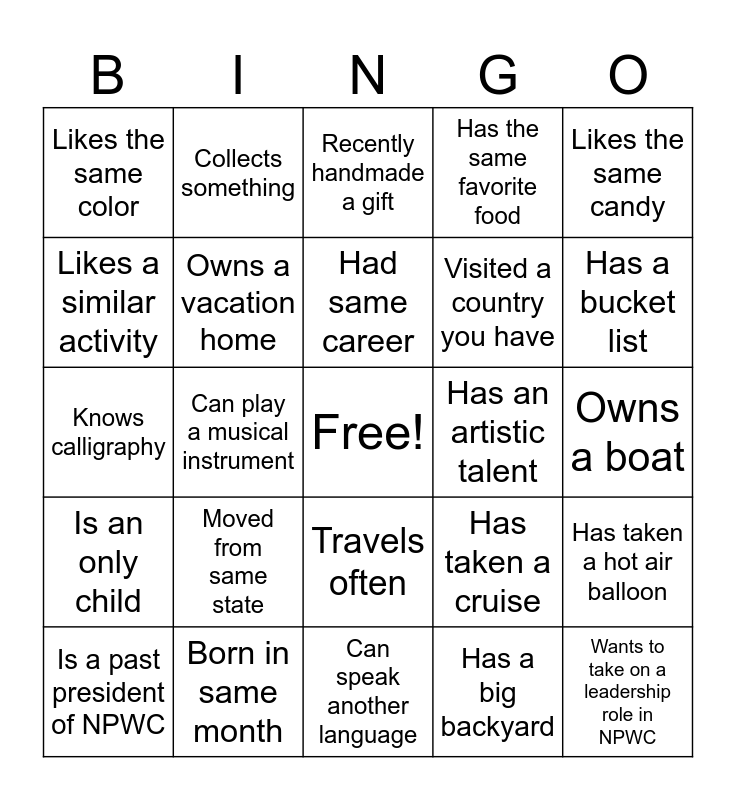 This bingo card has a free space and 24 words: Moved from same state, Born in same month, Had same career, Is a past president of NPWC, Likes the same candy, Likes the same color, Likes a similar activity, Collects something, Has an artistic talent, Travels often, Visited a country you have, Knows calligraphy, Has taken a cruise, Has taken a hot air balloon, Owns a vacation home, Has a big backyard, Owns a boat, Recently handmade a gift, Has a bucket list, Can play a musical instrument, Wants to take on a leadership role in NPWC, Is an only child, Has the same favorite food and Can speak another language.