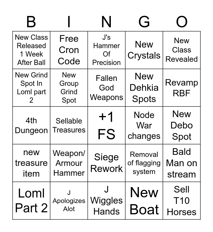 This bingo card has a free space and 24 words: Weapon/ Armour Hammer, J Apologizes Alot, Fallen God Weapons, Loml Part 2, New Class Revealed, New Class Released 1 Week After Ball, New Grind Spot In Loml part 2, Free Cron Code, Node War changes, Siege Rework, New Dehkia Spots, 4th Dungeon, Removal of flagging system, Bald Man on stream, New Group Grind Spot, New Boat, New Debo Spot, J's Hammer Of Precision, Revamp RBF, Sellable Treasures, Sell T10 Horses, new treasure item, New Crystals and J Wiggles Hands.