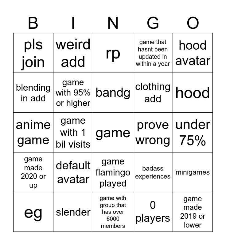 This bingo card has a free space and 24 words: default avatar, slender, bandg, eg, hood avatar, pls join, blending in add, weird add, prove wrong, game flamingo played, clothing add, anime game, badass experiences, minigames, game with 95% or higher, 0 players, under 75%, rp, hood, game with 1 bil visits, game made 2019 or lower, game made 2020 or up, game that hasnt been updated in within a year and game with group that has over 6000 members.