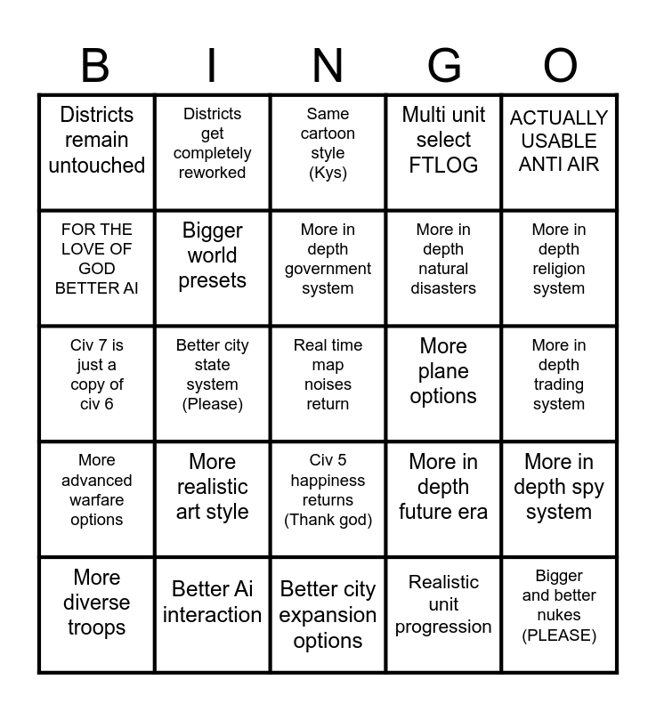 This bingo card has a free space and 24 words: More realistic art style, Better Ai interaction, More in depth government system, More diverse troops, ACTUALLY USABLE ANTI AIR, Districts remain untouched, FOR THE LOVE OF GOD BETTER AI, Districts get completely reworked, More plane options, Civ 5 happiness returns (Thank god), More in depth natural disasters, Civ 7 is just a copy of civ 6, More in depth future era, More in depth spy system, Bigger world presets, Realistic unit progression, More in depth trading system, Same cartoon style (Kys), More in depth religion system, Better city state system (Please), Bigger and better nukes (PLEASE), More advanced warfare options, Multi unit select FTLOG and Better city expansion options.