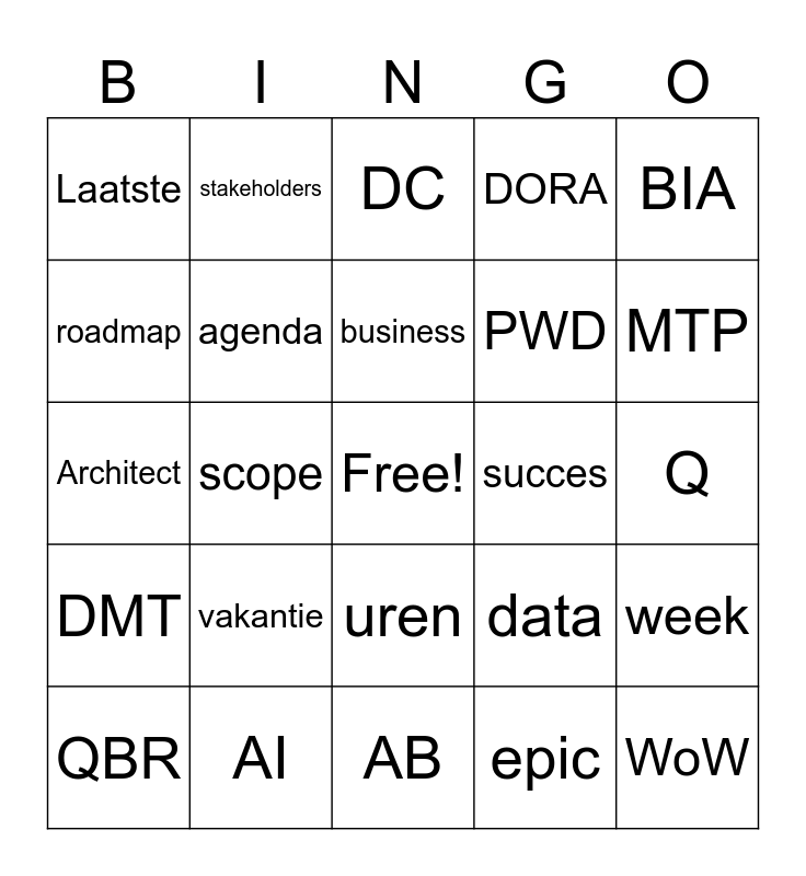 This bingo card has a free space and 29 words: QBR, impact, scope, LMP, Laatste, DC, agenda, vakantie, succes, AI, Q, WoW, AB, epic, MTP, groen, uren, DMT, BIA, Architect, data, cloud, PWD, roadmap, DORA, stakeholders, week, business and uitdaging.