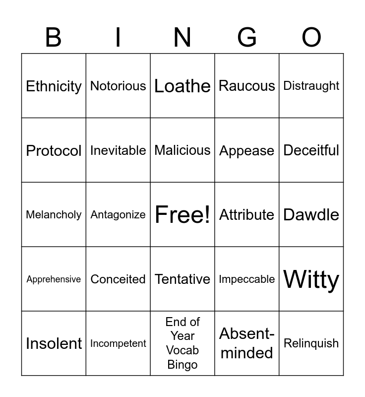 This bingo card has a free space and 31 words: End of Year Vocab Bingo, Dismal, Antagonize, Emulate, Ethnicity, Loathe, Inevitable, Impeccable, Attribute, Absent-minded, Dawdle, Relinquish, Initiate, Irate, Deceitful, Misgivings, Witty, Conceited, Apprehensive, Tentative, Distraught, Sly, Insolent, Notorious, Appease, Protocol, Raucous, Melancholy, Incompetent, Malicious and Defiant.