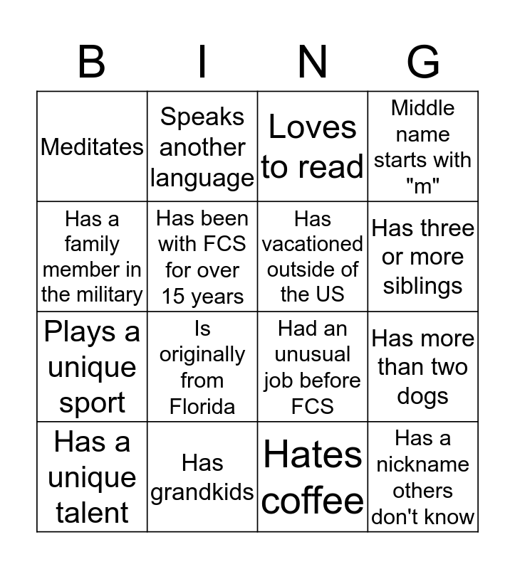 This bingo card has 16 words: Has grandkids, Has more than two dogs, Loves to read, Meditates, Plays a unique sport, Speaks another language, Had an unusual job before FCS, Hates coffee, Has a family member in the military, Has been with FCS for over 15 years, Has a unique talent, Middle name starts with "m", Is originally from Florida, Has three or more siblings, Has vacationed outside of the US and Has a nickname others don't know.