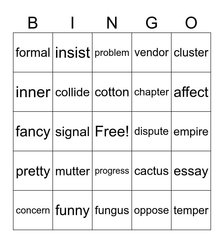 This bingo card has a free space and 25 words: mutter, fungus, cotton, concern, cluster, formal, inner, insist, dispute, progress, chapter, fancy, cactus, essay, collide, alter, empire, problem, affect, signal, temper, funny, pretty, vendor and oppose.