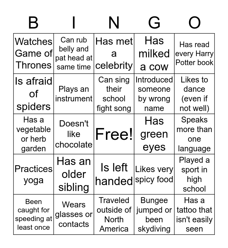 This bingo card has a free space and 24 words: Has an older sibling, Wears glasses or contacts, Can sing their school fight song, Been caught for speeding at least once, Has read every Harry Potter book, Watches Game of Thrones, Is afraid of spiders, Can rub belly and pat head at same time, Has green eyes, Is left handed, Introduced someone by wrong name, Has a vegetable or herb garden, Likes very spicy food, Played a sport in high school, Plays an instrument, Bungee jumped or been skydiving, Speaks more than one language, Has met a celebrity, Likes to dance (even if not well), Doesn't like chocolate, Has a tattoo that isn't easily seen, Practices yoga, Has milked a cow and Traveled outside of North America.