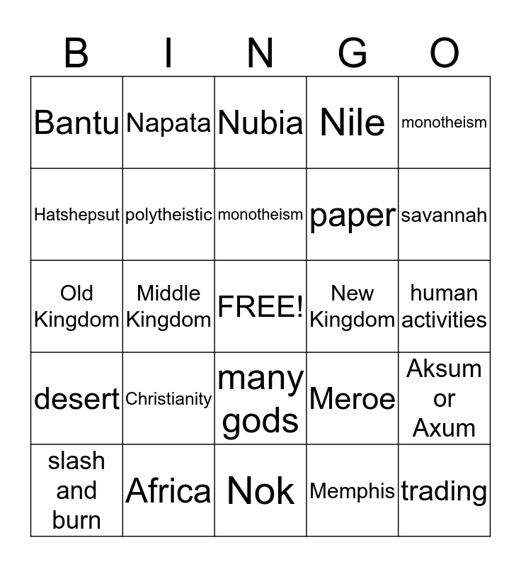 This bingo card has a free space and 24 words: Christianity, Africa, monotheism, slash and burn, monotheism, Bantu, Hatshepsut, Napata, New Kingdom, many gods, paper, Old Kingdom, Meroe, Aksum or Axum, polytheistic, Memphis, human activities, Nubia, savannah, Middle Kingdom, trading, desert, Nile and Nok.