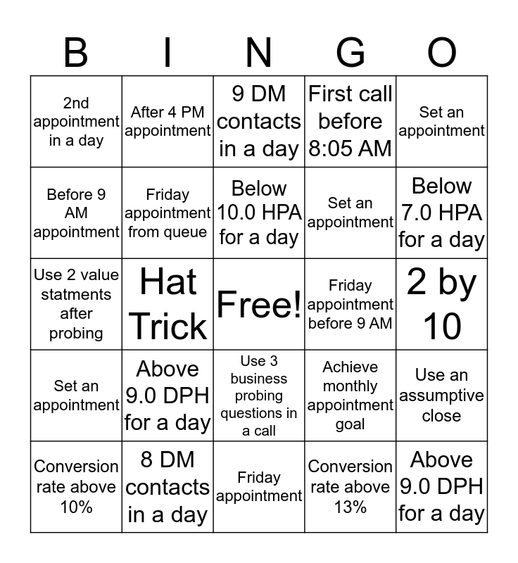 This bingo card has a free space and 24 words: Above 9.0 DPH for a day, 8 DM contacts in a day, Below 10.0 HPA for a day, Conversion rate above 10%, Set an appointment, 2nd appointment in a day, Before 9 AM appointment, After 4 PM appointment, Friday appointment before 9 AM, Use 3 business probing questions in a call, Set an appointment, Use 2 value statments after probing, Achieve monthly appointment goal, Use an assumptive close, Friday appointment from queue, Conversion rate above 13%, 2 by 10, 9 DM contacts in a day, Below 7.0 HPA for a day, Hat Trick, Above 9.0 DPH for a day, Set an appointment, First call before 8:05 AM and Friday appointment.