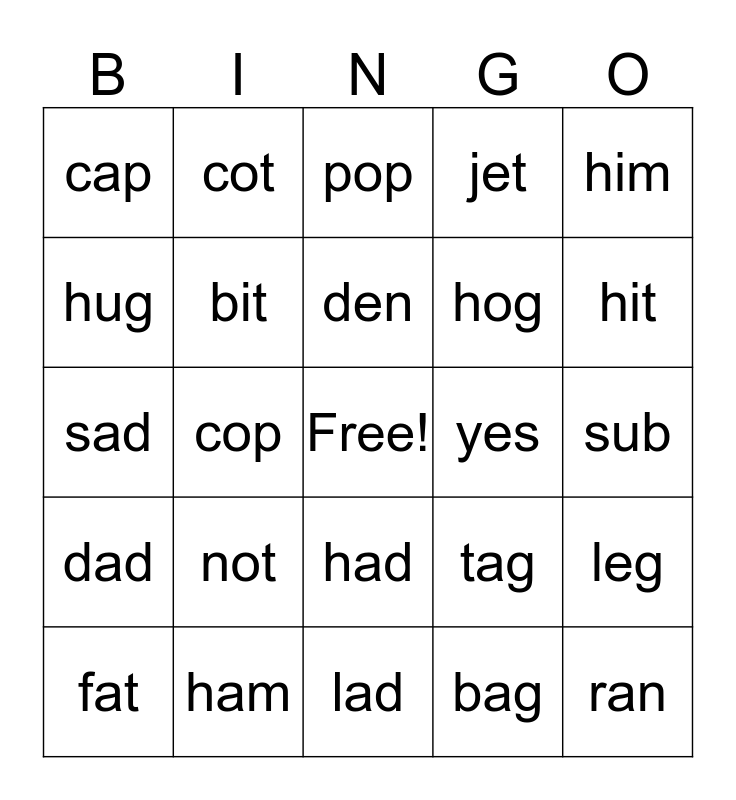This bingo card has a free space and 24 words: not, ham, den, fat, him, cap, hug, cot, yes, had, hog, sad, tag, leg, bit, bag, sub, pop, hit, cop, ran, dad, jet and lad.