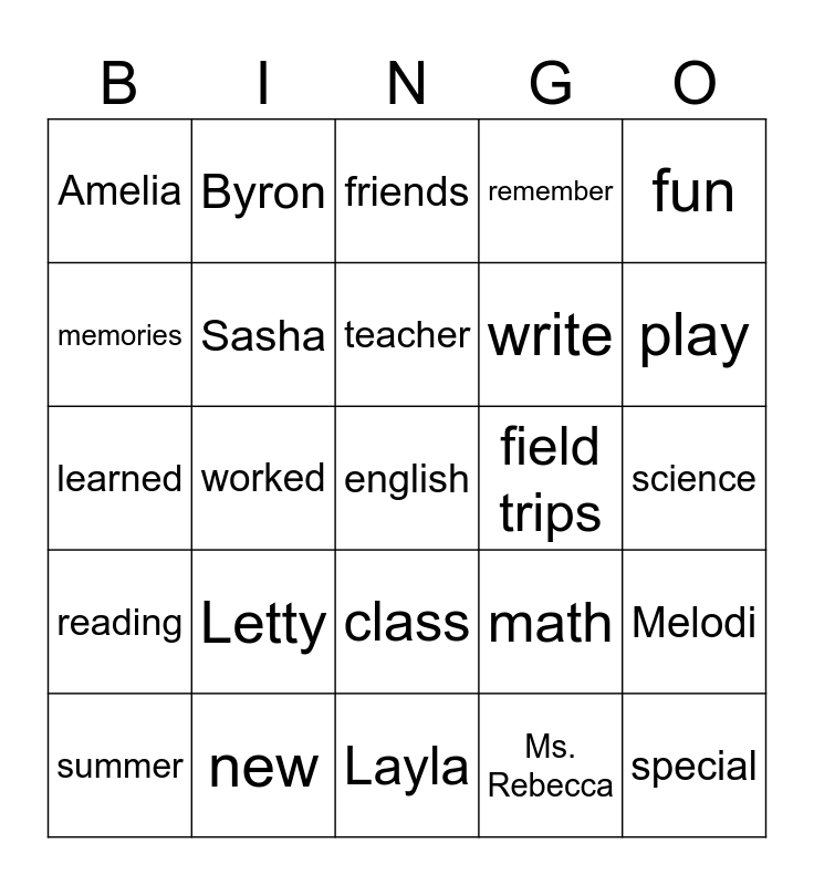 This bingo card has a free space and 24 words: Letty, new, teacher, summer, fun, Amelia, memories, Byron, field trips, class, write, learned, math, Melodi, Sasha, Ms. Rebecca, science, friends, play, worked, special, reading, remember and Layla.