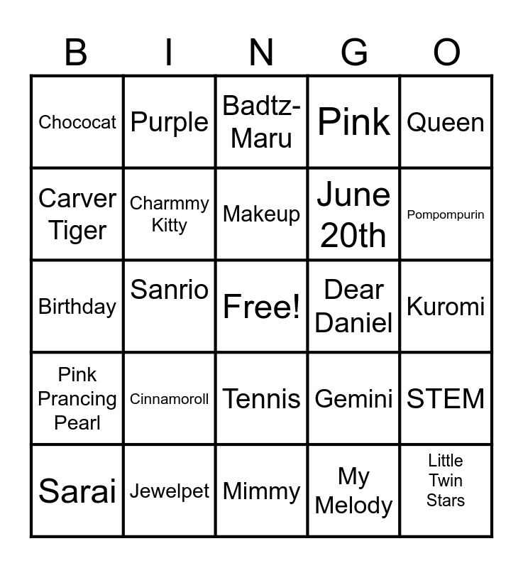 This bingo card has a free space and 29 words: Sarai, Hello Kitty, Sanrio, Keroppi, Chococat, Badtz-Maru, Charmmy Kitty, Cinnamoroll, Dear Daniel, Jewelpet, Kuromi, Little Twin Stars, Mimmy, My Melody, Pompompurin, Steak, Tennis, Pink Prancing Pearl, Queen, Birthday, Gemini, 14, June 20th, Carver Tiger, Pink, Purple, STEM, Makeup and Dance.
