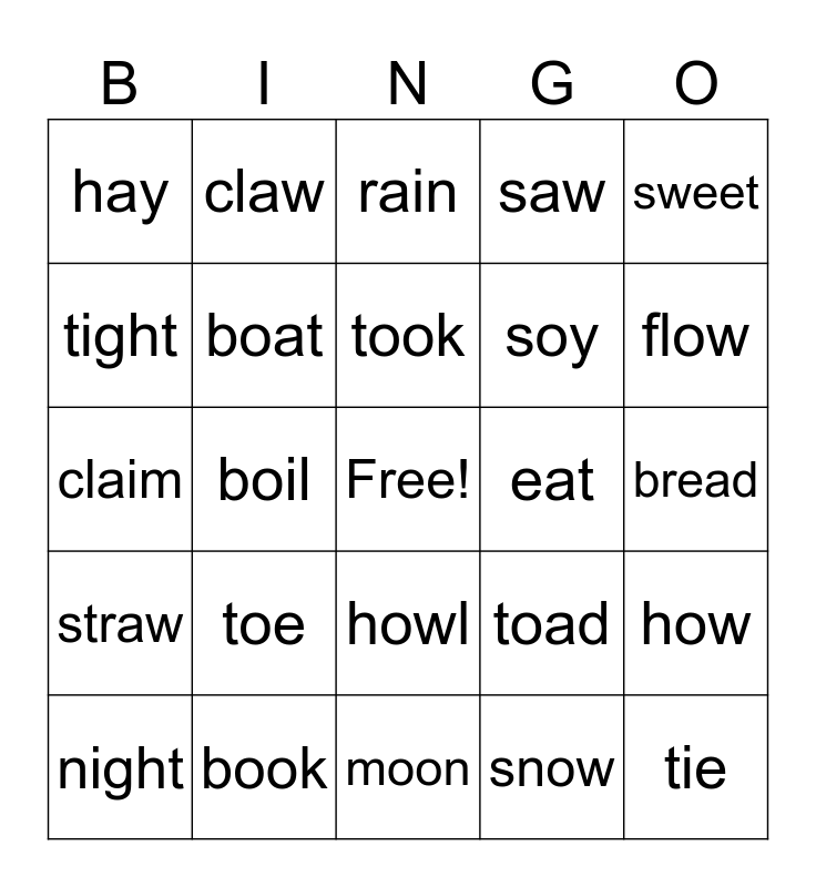 This bingo card has a free space and 29 words: night, toy, boil, sauce, hay, rain, boat, toe, eat, book, bread, tie, moon, snow, flow, owl, howl, straw, sweet, claim, toad, own, soy, tight, saw, claw, how, took and glow.