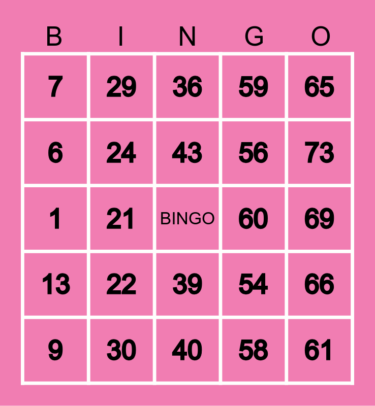 This bingo card has a free space and 24 words: 9, 22, 43, 58, 65, 7, 29, 36, 60, 69, 1, 24, 54, 66, 6, 30, 40, 59, 73, 13, 21, 39, 56 and 61.