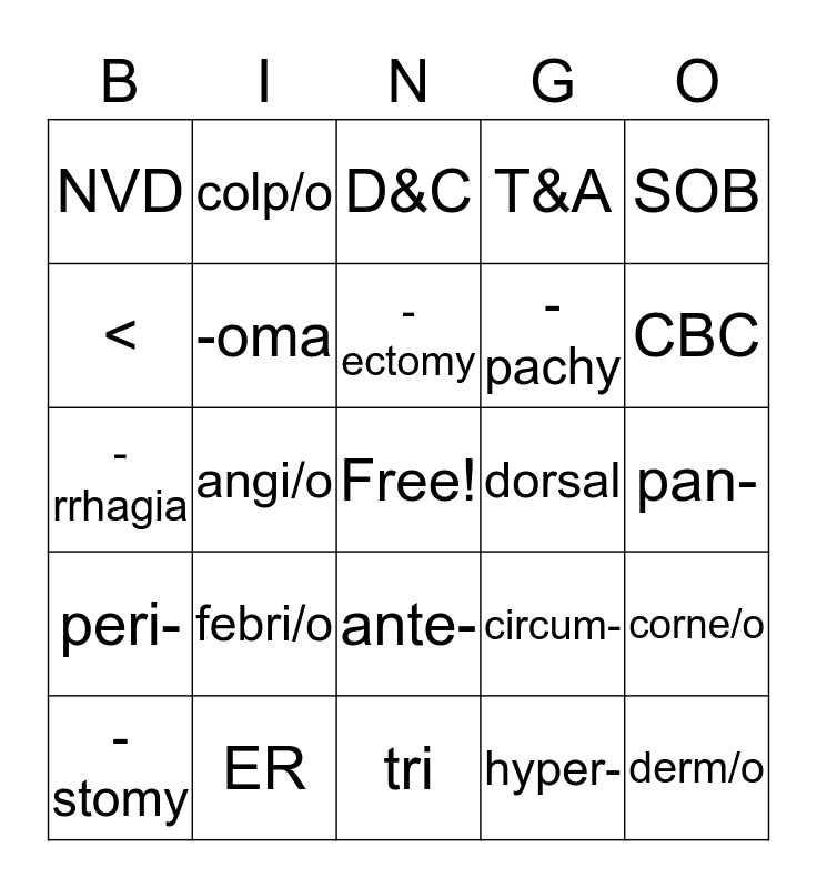 This bingo card has a free space and 82 words: auricl/o, tympan/o HDL, D&C, oophor/o, sial/o, homeo-, GU, I&D, -ist, lith/o, OPD, -desis, -oma, dorsal, chron/o, NVD, -stomy, <, MI, hydr/o, superficial, -pachy, derm/o, SOB, angi/o, -pexy, -sect, ROM, supra-, abdomin/o, febri/o, frontal, -rrhagia, Hgb, PTT, tri, dacry/o, gloss/o, CBC, CPE, gluc/o, T&A, URI, UTI, hyster/o, colp/o, episi/o, -ectomy, -plasty, -tomy, -para, pan-, ER, dx, >, L, R, ab-, ad-, circum-, epi-, meso-, peri-, BUN, FBS, HDL, pH, PLT, WBC, retro-, sub-, ambi-, ante-, hyper-, hypo-, AST, CT, creat, mamm/o, cyst/o, corne/o and path/o.