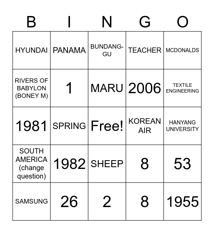 This bingo card has a free space and 25 words: 1982, 2, MARU, SAMSUNG, MCDONALDS, HYUNDAI, RIVERS OF BABYLON (BONEY M), PANAMA, KOREAN AIR, SHEEP, 2006, 1981, 8, 53, 1, 5, HANYANG UNIVERSITY, BUNDANG-GU, TEXTILE ENGINEERING, SPRING, 1955, 26, SOUTH AMERICA (change question), TEACHER and 8.