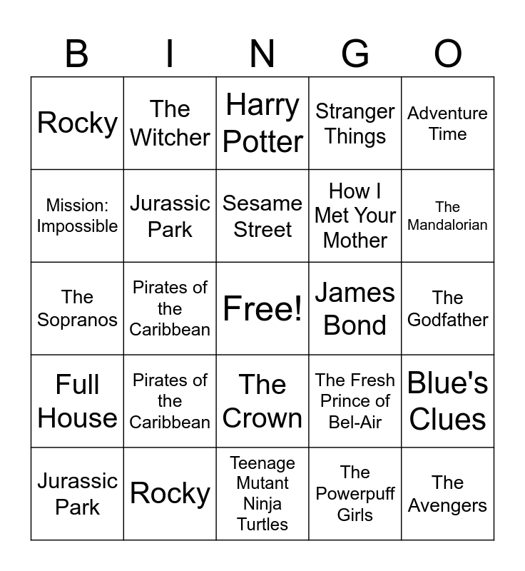 This bingo card has a free space and 29 words: Jurassic Park, Harry Potter, Pirates of the Caribbean, James Bond, Rocky, Harry Potter, Jurassic Park, Pirates of the Caribbean, James Bond, Rocky, The Godfather, The Avengers, Teenage Mutant Ninja Turtles, The Powerpuff Girls, The Mandalorian, Rick and Morty, The Crown, Full House, Adventure Time, The Sopranos, The Fresh Prince of Bel-Air, Seinfeld, How I Met Your Mother, Mission: Impossible, Stranger Things, The Witcher, Blue's Clues, Sesame Street and Dora the Explorer.