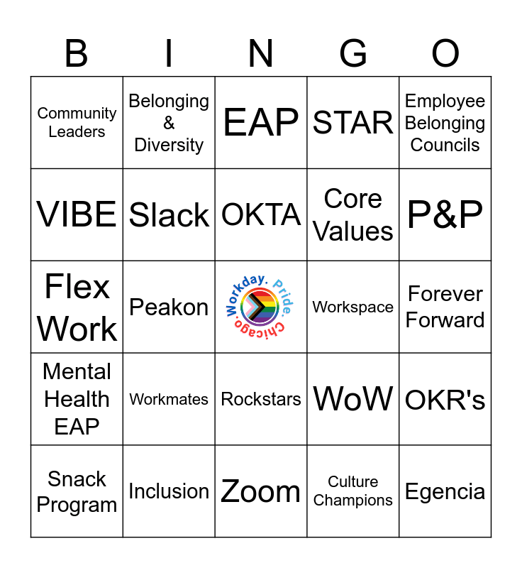 This bingo card has a free space and 25 words: Workmates, Zoom, OKTA, Snack Program, Employee Belonging Councils, Community Leaders, VIBE, Belonging & Diversity, Workspace, Rockstars, Core Values, Flex Work, WoW, OKR's, Slack, AI, Forever Forward, EAP, P&P, Peakon, Egencia, Inclusion, Mental Health EAP, STAR and Culture Champions.
