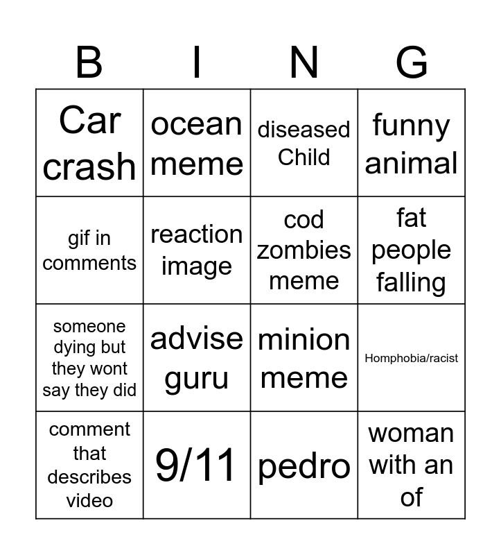 This bingo card has 16 words: 9/11, Homphobia/racist, diseased Child, Car crash, someone dying but they wont say they did, ocean meme, minion meme, pedro, gif in comments, reaction image, comment that describes video, funny animal, advise guru, fat people falling, cod zombies meme and woman with an of.