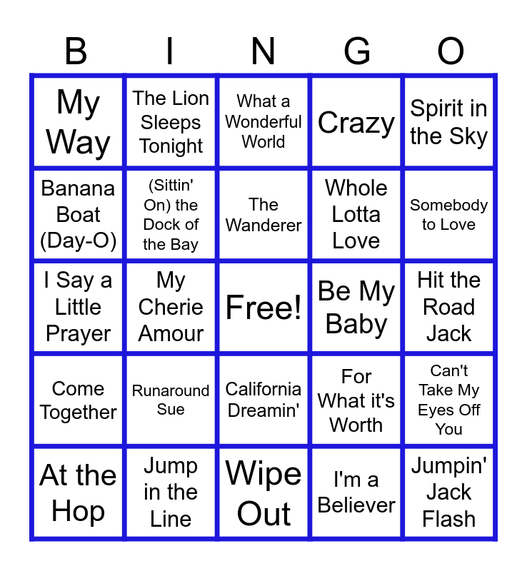 This bingo card has a free space and 24 words: Runaround Sue, Jump in the Line, The Wanderer, At the Hop, Spirit in the Sky, My Way, Banana Boat (Day-O), The Lion Sleeps Tonight, Be My Baby, California Dreamin', Whole Lotta Love, I Say a Little Prayer, For What it's Worth, Can't Take My Eyes Off You, (Sittin' On) the Dock of the Bay, I'm a Believer, Hit the Road Jack, What a Wonderful World, Somebody to Love, My Cherie Amour, Jumpin' Jack Flash, Come Together, Crazy and Wipe Out.