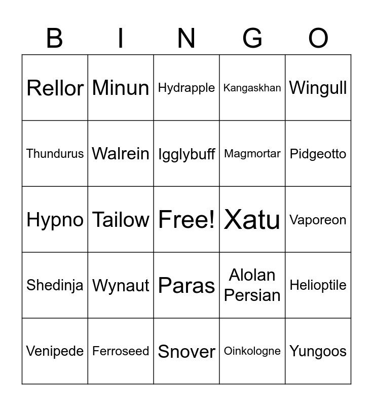 This bingo card has a free space and 24 words: Wynaut, Ferroseed, Igglybuff, Venipede, Wingull, Rellor, Thundurus, Minun, Xatu, Paras, Magmortar, Hypno, Alolan Persian, Helioptile, Walrein, Oinkologne, Vaporeon, Hydrapple, Pidgeotto, Tailow, Yungoos, Shedinja, Kangaskhan and Snover.