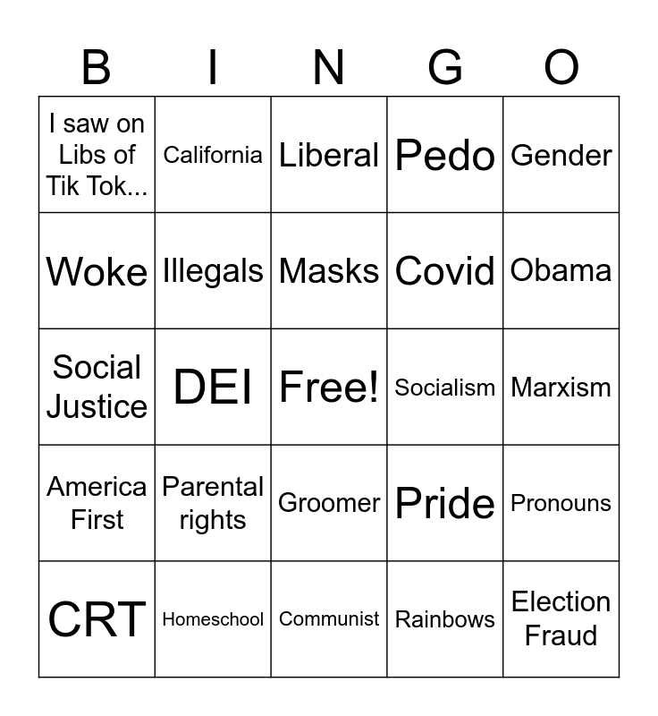 This bingo card has a free space and 24 words: Parental rights, Homeschool, Masks, CRT, Gender, I saw on Libs of Tik Tok..., Woke, California, Socialism, Groomer, Covid, Social Justice, Pride, Pronouns, Illegals, Rainbows, Marxism, Liberal, Obama, DEI, Election Fraud, America First, Pedo and Communist.