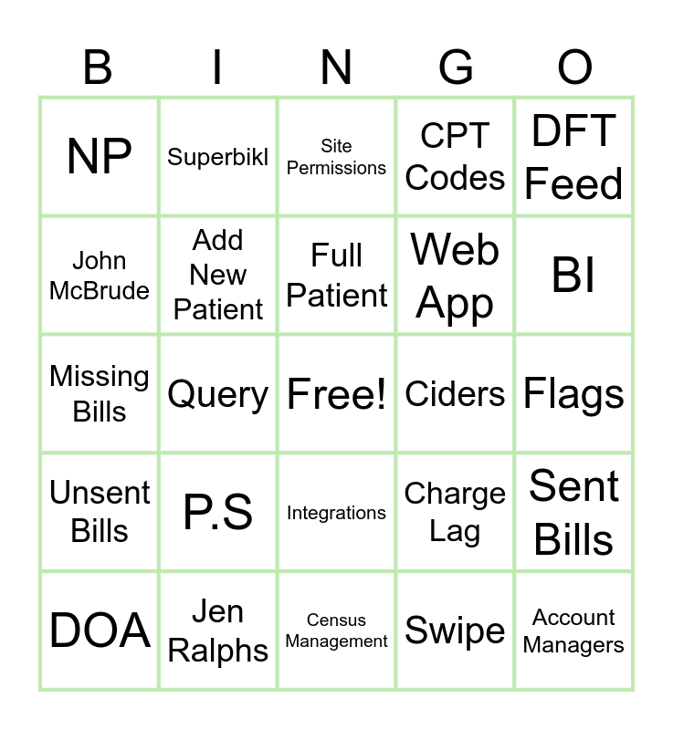 This bingo card has a free space and 75 words: SIU, T analyze Billing, Full Patient, ADT, Force Pop, IM360, Weblog, Temp full Patient, Archive, Bin, Web Dev, Mobile Dev, Integrations, Web App, Mobile app, John McBrude, Jen Ralphs, Kelly Tansey, Kurt Lambert, BI, Sophia Smith, Superbikl, Census Management, CPT Codes, DFT Feed, MODIFIERS, PHI, Password, Mobile Lock, Web Lick, PBDE, My Bills, Enterprise Billing, Charge Lag, Flags, NP, Admin, Physicians, Ciders, Account Managers, Clients, Chats, Emails, Template, Subject, Description, Query, Site Permissions, Site Settings, Full Sync, Site Sync, Add New Patient, Patient's List, Access, Schedule TAB, Schedule MDID, Biller Mappings, Pos Editor, Site Team Editor, DOD, DOA, Auto Archuve, Care Team, Master Coder, MIPs, Missing Bills, Bills Matrix, Batched Bills, Group Settins, Sent Bills, Unsent Bills, P.S, Implementation, Swipe and eDOD.