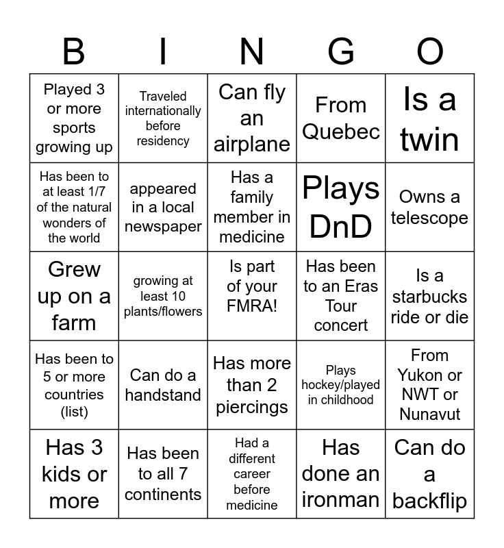 This bingo card has a free space and 121 words: From British Columbia, From Saskatchewan, From Manitoba, From Alberta, From Nova Scotia, From Ontario, From Quebec, From Newfoundland or the Maritimes, From Yukon or NWT or Nunavut, IMG Student, Went to the University of Alberta for another degree, Has 2 or more degrees (not including medical school), Wears glasses, Wearing a blue shirt, Wearing a skirt/dress, Has dyed their hair, Has more than 2 piercings, Owns a duckanna, Owns 4 budgies, Skiis on black diamonds, Has 3 kids or more, Can fly an airplane, Can drive manual/standard, Has worked as a butcher, Has been to 10 or more countries (list), Has been to 5 or more countries (list), Has been to all 7 continents, Has eaten a carolina reaper, Has run a marathon, Has done a triathlon, Has done an ironman, growing at least 10 plants/flowers, Has a family member in medicine, Can make macarons, Has eaten 9 cans of ravioli, Knows 3 coding languages, Can knit a sweater, Has sold/sells handmade crafted items, Plays 2 or more instruments, Has played in an orchestra / concert band, Has played in jazz band, Has been to a rave, Can two-step, Has a Ford F150, Watches anime, Has been to animethon in Edmonton, Watches telenovelas, Has been to an Eras Tour concert, Has a photo with and met a celebrity, Has given a speech, Runs a social media account, Can bench their own weight, Plays hockey/played in childhood, Had/has a reptile pet, Had/has at least 4 pets, Uses a bike to commute, Owns at least 3 different types of cooking oil, Does not drink coffee, Does not drink diet coke OR redbull, Traveled internationally before residency, Has been on the high level bridge streetcar, Has been to an edmonton symphony orchestra performance, Someone who plays in a band, Has been to a home oilers game, Has their birthday on a holiday, Has been to at least 1/7 of the natural wonders of the world, Is bilingual, Is trilingual, Competed nationally in _______, Has been to the Royal Tyrrell Museum, Grew up on a farm, Has been to Jasper, Has at least 4 siblings, Knows sign language, Plays warhammer, Plays DnD, Has a costco card, Plays genshin impact, Is double jointed, Can do a backflip, Can do a handstand, Played 3 or more sports growing up, Plays/played lacrosse, Has read at least 6 books this year, Does digital art, Does traditional art, Can ride a unicycle, Can do the butterfly stroke, Is a starbucks ride or die, Sews their own clothes, Has been on TV, Has been in a movie, Had a different career before medicine, Has gone on a roadtrip across canada or US, Makes/has made their own alcohol, Has a sourdough starter older than 2 years, Has been to a renaissance fair, Has skydived, Is a twin, Someone who has published a book / written work, been to Antarctica, certified scuba diver, hiked the Appalachian Trail, performed in a dance recital, appeared in a local newspaper, Completed a wilderness survival course, Built their own furniture, Served in the military, Performed stand-up comedy, Done a bungee jump, Owned a farm animal, Designed and built a website, Been a competitive chess player, Played a competitive sport at a collegiate level, Played a role in a theater production, Owns a telescope, Has done cosplay, Has been to a ghost tour or haunted location, Has a lucky charm they carry everywhere, Can do magic tricks and Grows fruits/vegetables.