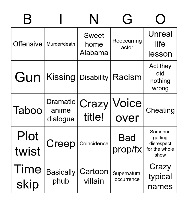 This bingo card has a free space and 24 words: Creep, Basically phub, Disability, Time skip, Unreal life lesson, Offensive, Gun, Murder/death, Voice over, Coincidence, Racism, Taboo, Bad prop/fx, Someone getting disrespect for the whole show, Kissing, Supernatural occurrence, Cheating, Sweet home Alabama, Act they did nothing wrong, Dramatic anime dialogue, Crazy typical names, Plot twist, Reoccurring actor and Cartoon villain.