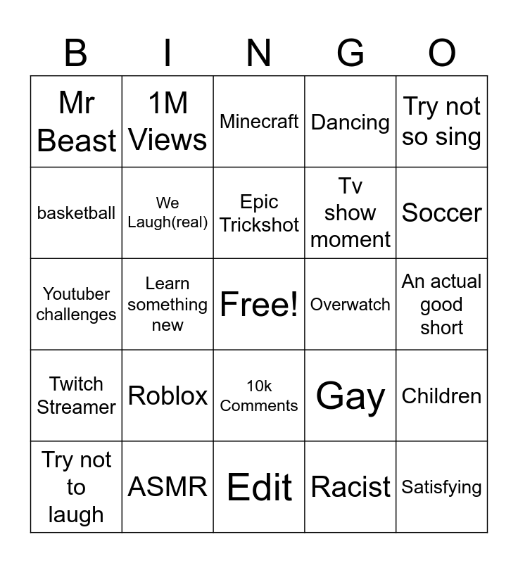This bingo card has a free space and 24 words: Roblox, ASMR, Epic Trickshot, Try not to laugh, Try not so sing, Mr Beast, basketball, 1M Views, Overwatch, 10k Comments, Tv show moment, Youtuber challenges, Gay, Children, We Laugh(real), Racist, An actual good short, Minecraft, Soccer, Learn something new, Satisfying, Twitch Streamer, Dancing and Edit.