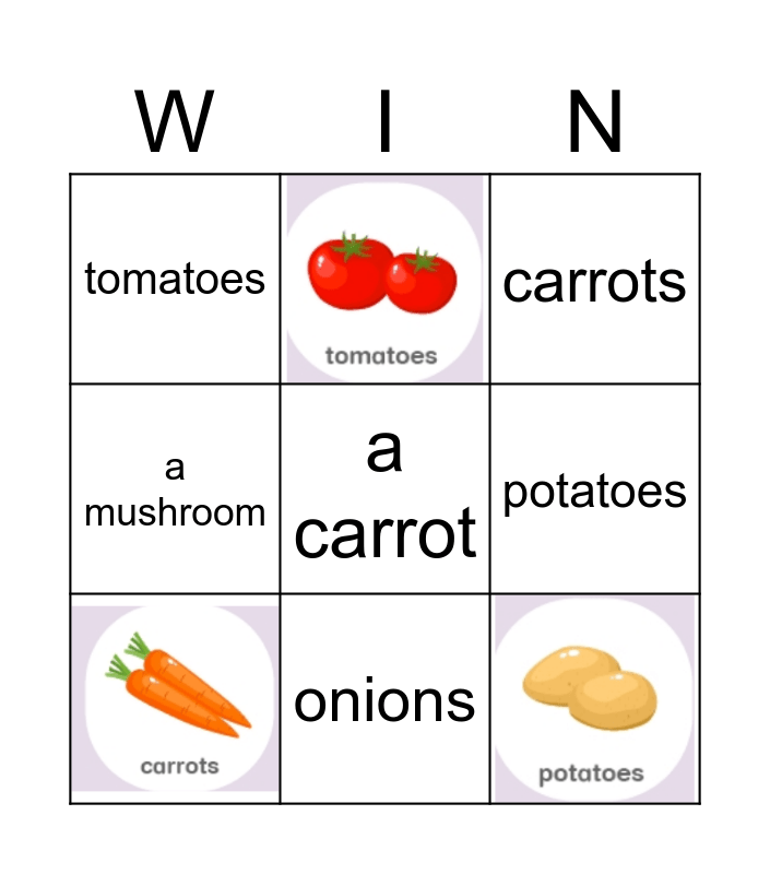 This bingo card has 6 images and 10 words: corn, onions, potatoes, tomatoes, a carrot, carrots, mushrooms, an onion, a tomato and a mushroom.