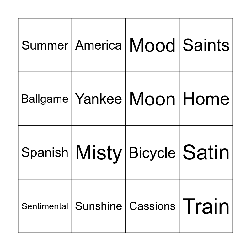 This bingo card has 25 words: Free!, Tennessee, Home, Bonnie, Ballgame, Summer, Yankee, America, Sunshine, Rainbow, Spanish, Bicycle, Blue, Blackbird, Moon, Misty, Cassions, Mood, Misty, Satin, Sentimental, Rainbow, Train, Saints and Young.