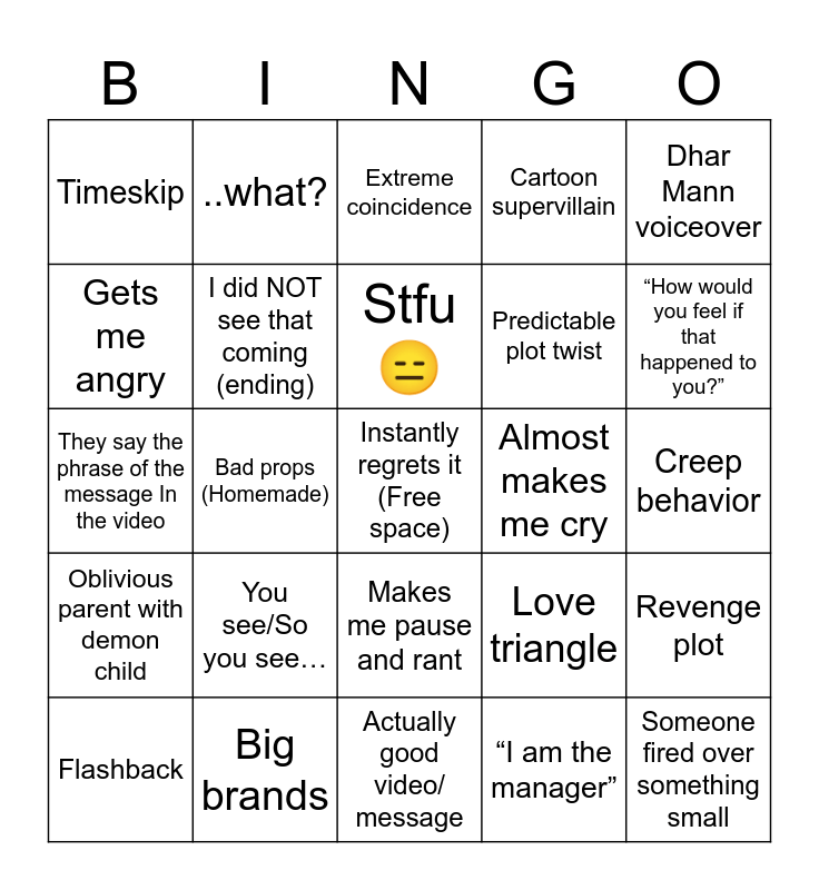 This bingo card has a free space and 24 words: You see/So you see…, Big brands, Stfu 😑, Flashback, Dhar Mann voiceover, Timeskip, Gets me angry, ..what?, Almost makes me cry, Makes me pause and rant, Predictable plot twist, They say the phrase of the message In the video, Love triangle, Revenge plot, I did NOT see that coming (ending), “I am the manager”, Creep behavior, Extreme coincidence, “How would you feel if that happened to you?”, Bad props (Homemade), Someone fired over something small, Oblivious parent with demon child, Cartoon supervillain and Actually good video/ message.