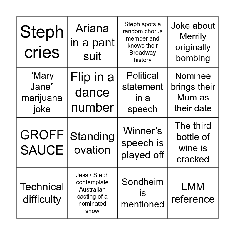 This bingo card has 16 words: Jess / Steph contemplate Australian casting of a nominated show, The third bottle of wine is cracked, Steph spots a random chorus member and knows their Broadway history, Steph cries, GROFF SAUCE, Ariana in a pant suit, Winner’s speech is played off, Sondheim is mentioned, “Mary Jane” marijuana joke, Flip in a dance number, Technical difficulty, Joke about Merrily originally bombing, Standing ovation, Nominee brings their Mum as their date, Political statement in a speech and LMM reference.