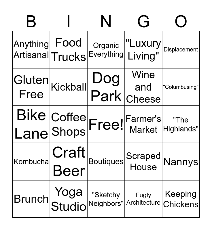 This bingo card has a free space and 24 words: Craft Beer, Yoga Studio, Dog Park, Brunch, Displacement, Anything Artisanal, Gluten Free, Food Trucks, Farmer's Market, Boutiques, Wine and Cheese, Bike Lane, Scraped House, Nannys, Kickball, Fugly Architecture, "The Highlands", Organic Everything, "Columbusing", Coffee Shops, Keeping Chickens, Kombucha, "Luxury Living" and "Sketchy Neighbors".
