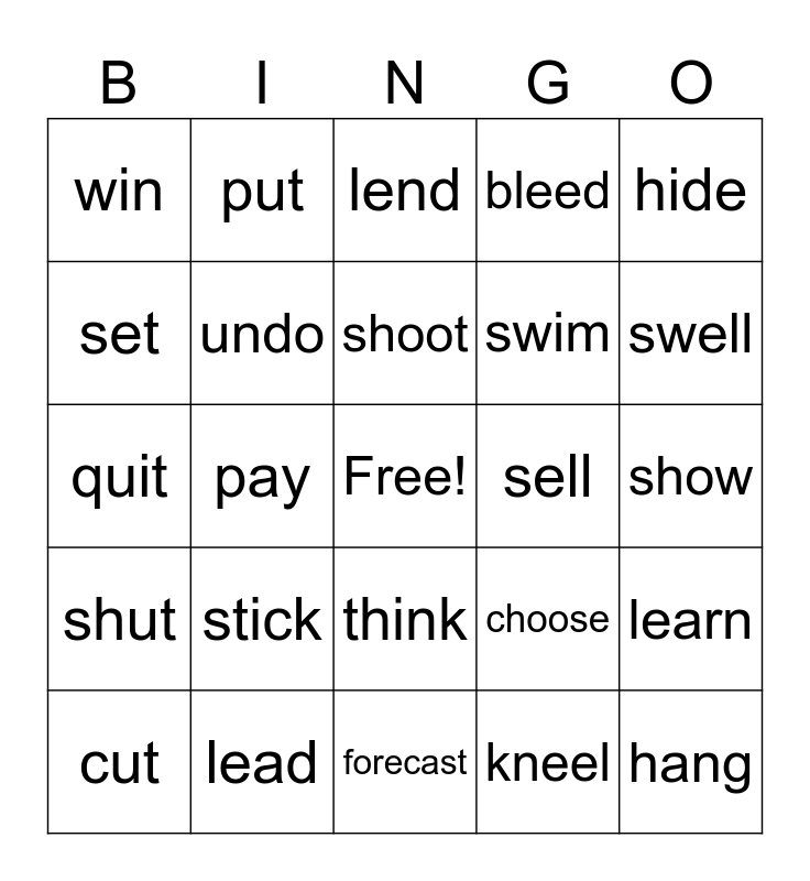 This bingo card has a free space and 145 words: be, begin, buy, can, catch, choose, come, do, draw, drink, drive, eat, feel, find, fly, get, give, go, have, hear, know, learn, leave, make, meet, pay, put, read, ride, run, say, see, send, show, sing, sit, sleep, speak, swim, take, teach, tell, think, understand, wake, wear, write, become, break, bring, build, cost, cut, dream, fall, forget, hit, hold, hurt, keep, lend, lie, lose, mean, ring, sell, shut, spell, spend, stand, steal, throw, win, grow, must, try, babysit, beat, bite, bleed, blow, breastfeed, burn, deal, dig, dive, feed, fight, fit, forecast, forgive, freeze, knit, lay, lead, let, light, prove, quit, rebuild, rise, set, sew, shake, shine, shoot, sink, smell, spill, split, spoil, stick, strike, swell, tear, hang, hide, bear, bear, bend, breed, broadcast, burst, forbid, kneel, lean, mistake, misunderstand, overcome, overtake, overwrite, seek, shrink, slide, sting, swear, sweat, sweep, swing, thrust, undo, upset, wet, wind and wring.