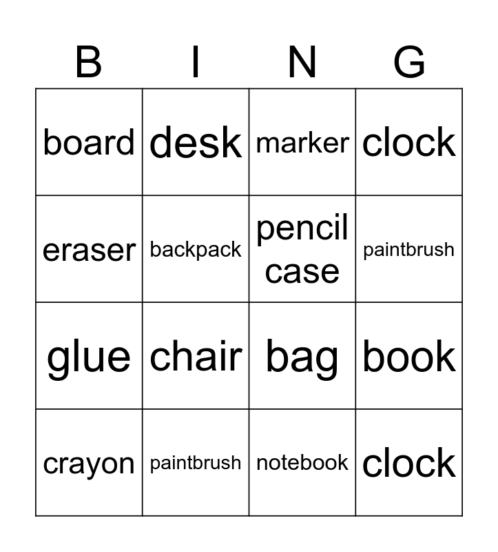 This bingo card has 20 words: book, ruler, marker, paint, crayon, eraser, paintbrush, board, glue, desk, chair, bag, backpack, clock, pencil case, table, paintbrush, clock, notebook and glue.