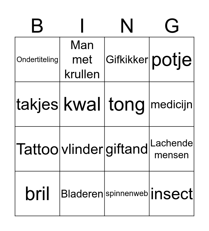 This bingo card has 16 words: Bladeren, Lachende mensen, Gifkikker, Ondertiteling, Tattoo, Man met krullen, giftand, spinnenweb, takjes, kwal, bril, potje, vlinder, medicijn, tong and insect.