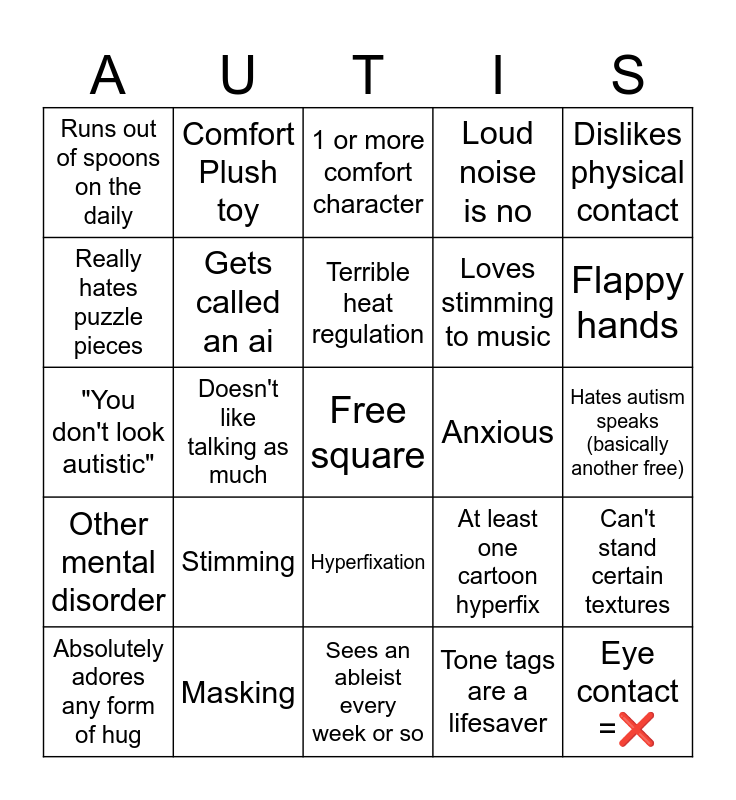 This bingo card has a free space and 24 words: Stimming, Masking, Terrible heat regulation, Absolutely adores any form of hug, Dislikes physical contact, Runs out of spoons on the daily, Really hates puzzle pieces, Comfort Plush toy, Anxious, Hyperfixation, Loves stimming to music, "You don't look autistic", At least one cartoon hyperfix, Can't stand certain textures, Gets called an ai, Tone tags are a lifesaver, Hates autism speaks (basically another free), 1 or more comfort character, Flappy hands, Doesn't like talking as much, Eye contact =❌️, Other mental disorder, Loud noise is no and Sees an ableist every week or so.