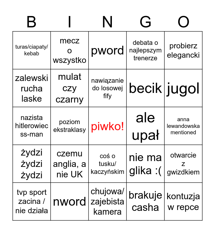 This bingo card has a free space and 24 words: czemu anglia, a nie UK, nword, nawiązanie do losowej fify, tvp sport zacina / nie działa, probierz elegancki, turas/ciapaty/ kebab, zalewski rucha laske, mecz o wszystko, ale upał, coś o tusku/ kaczyńskim, becik, nazista hitlerowiec ss-man, nie ma glika :(, otwarcie z gwizdkiem, mulat czy czarny, brakuje casha, anna lewandowska mentioned, pword, jugol, poziom ekstraklasy, kontuzja w repce, żydzi żydzi żydzi, debata o najlepszym trenerze and chujowa/ zajebista kamera.