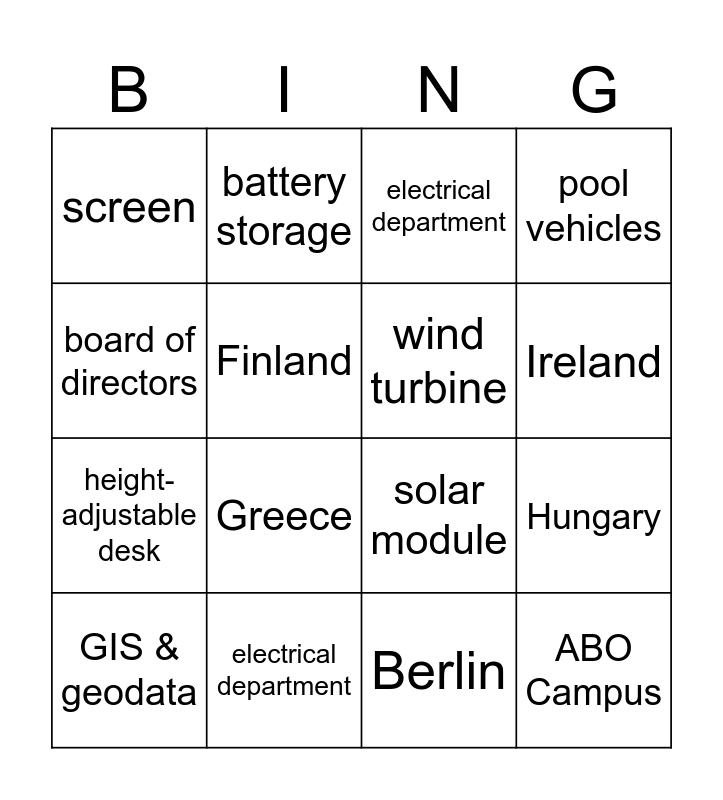 This bingo card has 74 words: Canada, Germany, electrical department, construction department, civil engineering department, solar department, project implementation, global meeting, summer party, France, Argentina, Spain, Ireland, Finland, Poland, Hungary, Colombia, Greece, Tunisia, solar module, wind turbine, battery storage, pool vehicles, Happy Friday, GIS & geodata, human resources, hybrid energy systems, product development and direct marketing, public relations, secretariat, board of directors, works council, job bike, ABO net, IT ticket, South Africa, welcome day, students, Christmas party, birthday present, training, sketching, accounting, list of colleagues, beamer, screen, bingo, ABO Wind, ABO Energy, Wiesbaden, Hanover, Rheine, Berlin, Dortmund, Erfurt, invoices, office, charades, language course, circular mail, height-adjustable desk, Ingelheim, ABO Campus, announcement, company policy, electrical department, file sharing, finance and sales, Waigandshain, works meeting, travel, manual, travel expense report, LOGA3 and working group.