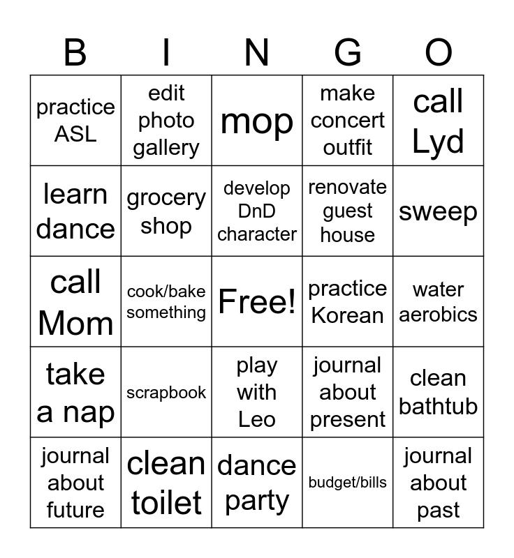 This bingo card has a free space and 35 words: laundry, dishes, cat litter, grocery shop, play with Leo, make concert outfit, learn dance, start a new book, develop DnD character, go on a walk, call Mom, call Lyd, meet a friend in person, practice Spanish, practice ASL, practice Korean, budget/bills, cook/bake something, take a nap, journal about past, journal about present, journal about future, clean bathtub, clean toilet, mop, sweep, have a treat, fix bike, renovate guest house, water aerobics, mani/Pedi for self or Leo, dance party, scrapbook, edit photo gallery and work on audiobook.