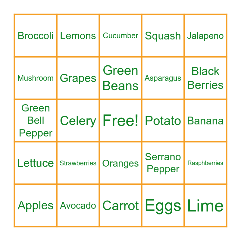 This bingo card has a free space and 29 words: Apples, Onion, Celery, Mango, Broccoli, Cucumber, Grapes, Strawberries, Potato, Avocado, Banana, Lime, Carrot, Eggs, Black Berries, Cilantro, Oranges, Lettuce, Jalapeno, Green Bell Pepper, Serrano Pepper, Tomato, Asparagus, Mushroom, Squash, Lemons, Rasphberries, Green Beans and Blue Berries.