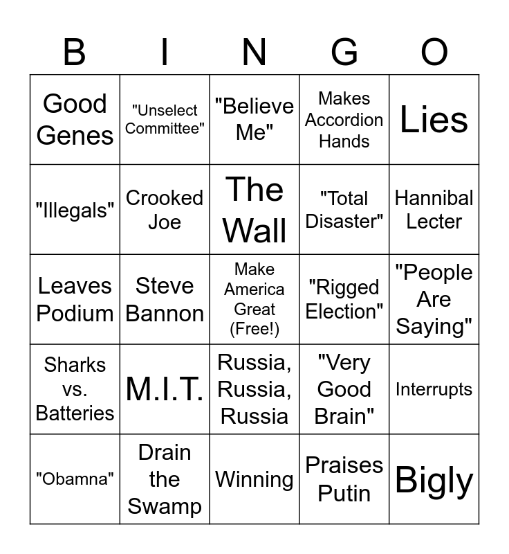 This bingo card has a free space and 39 words: "Huge", Tariffs, Fake Indictments, Crooked Joe, "Obamna", Russia, Russia, Russia, The Wall, China Virus, Lies, Sharks vs. Batteries, Steve Bannon, Makes Accordion Hands, Bigly, "People Are Saying", "Rigged Election", M.I.T., Deep State, Good Genes, "Nobody Knew", "Very Good Brain", "Illegals", Winning, "Total Disaster", Hannibal Lecter, Fake News, Witch Hunt, Fake Impeachment, Very Unfair, Deep State, "Unselect Committee", Sleepy Joe, Nancy/ Paul Pelosi, "Believe Me", Drain the Swamp, Praises Putin, Praises Kim Jun Un, Interrupts, Leaves Podium and Brags About Crowd Size/ Polls.
