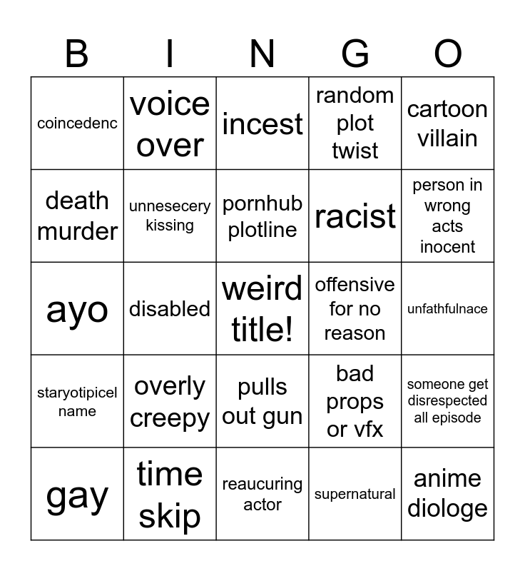 This bingo card has a free space and 24 words: overly creepy, time skip, pornhub plotline, gay, cartoon villain, coincedenc, death murder, voice over, offensive for no reason, pulls out gun, racist, ayo, bad props or vfx, someone get disrespected all episode, unnesecery kissing, supernatural, unfathfulnace, incest, person in wrong acts inocent, disabled, anime diologe, staryotipicel name, random plot twist and reaucuring actor.