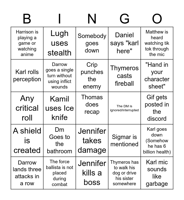 This bingo card has a free space and 24 words: Dm Goes to the bathroom, The force ballista is not placed during combat, Crip punches the enemy, Darrow lands three attacks in a row, Matthew is heard watching tik tok through the mic, Harrison is playing a game or watching anime, Karl rolls perception, Lugh uses stealth, The DM is ignored/interrupted, Jennifer takes damage, Thymeros casts fireball, Any critical roll, Sigmar is mentioned, Karl goes down (Somehow he has 6 billion health), Darrow goes a single turn without using inflict wounds, Thymeros has to walk his dog or drive his sister somewhere, Gif gets posted in the discord, Somebody goes down, "Hand in your character sheet", Kamil uses Ice knife, Karl mic sounds like garbage, A shield is created, Daniel says "karl here" and Jennifer kills a boss.