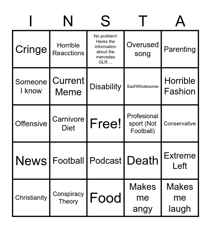 This bingo card has a free space and 29 words: Christianity, Veganism, Carnivore Diet, Dead meme, Cringe, No problem! Heres the information about the mercedes GLR...., Current Meme, Football, Profesional sport (Not Football), Conspiracy Theory, Conservative, Makes me laugh, Food, Makes me angy, Horrible Fashion, Horrible Take, Podcast, News, Parenting, Offensive, Death, I POST SCHOOL FIGHTS!!!, Sad/Wholesome, Someone I know, Overused song, Horrible Reacctions, Extreme Left, Disability and Meme thats acctually funny.